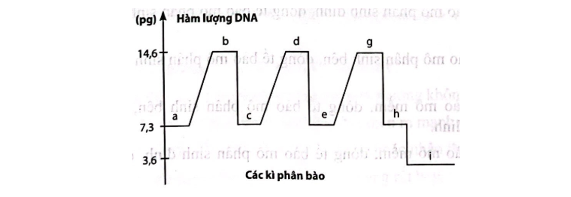 (1) Đặt tên cho đồ thị: Phân tích đồ thị ta thấy ở a, c, e, h hàm lượng DNA bằng 7,3.10-12g, trong khi ở b, d, g hàm lượng DNA bằng 14,6.10-12g (gấp đôi) nghĩa là đã có sự nhân đôi DNA và nhiễm sắc thể. Từ h chuyển sang i hàm lượng DNA lại giảm đi một nửa, chỉ còn 3,6.10-12 g nghĩa là đã có sự phân bào. Như vậy từ a đến e là quá trình nguyên phân liên tiếp; còn từ e đến I là quá trình giảm phân. Vậy đây là đồ thị mô tả sự phát triển của tế bào sinh dục.