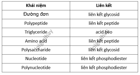 Đường đơn, polypeptide, liên kết phosphodiester, acid béo, liên kết peptide, triglyceride, amino acid, liên kết glycosid, liên kết ester, polysaccharide, nucleotide, polynucleotide.