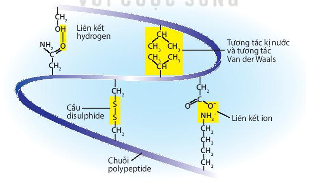 Cấu trúc bậc 3: Chuỗi polipeptid cuộn xoắn lại hoặc gấp nếp tạo nên cấu trúc không gian ba chiều đặc trưng do có sự tương tác đặc thù giữa các nhóm chức R của các amino acid trong chuỗi polipeptid.
