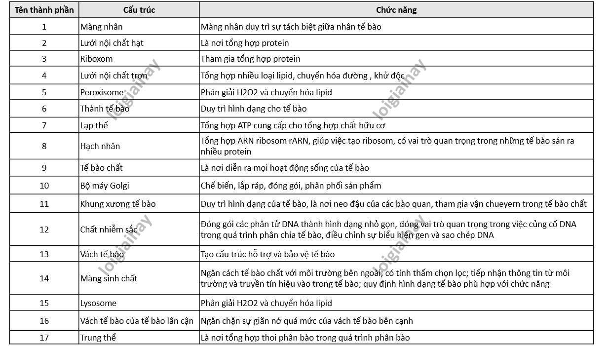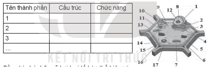 Chú thích tên các thành phần và hoàn thành bảng chức năng tương ứng của các thành phần cấu trúc tế bào thực vật theo mẫu đã cho dưới đây: