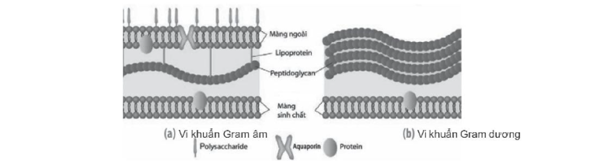 Vi khuẩn Gram dương có thành tế bào gồm nhiều lớp peptidoglycan, còn thành tế bào vi khuẩn Gram âm chỉ có một lớp mỏng peptidoglycan