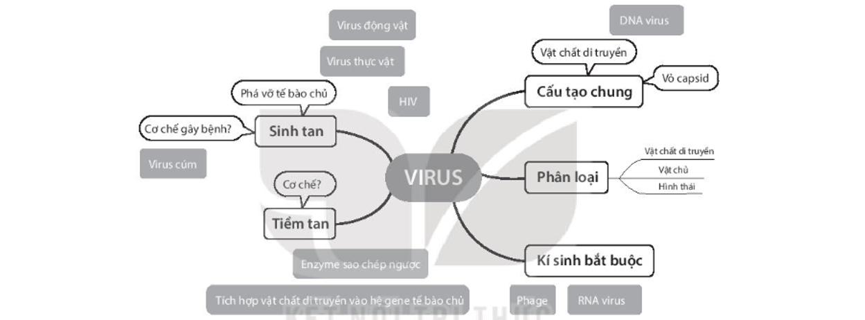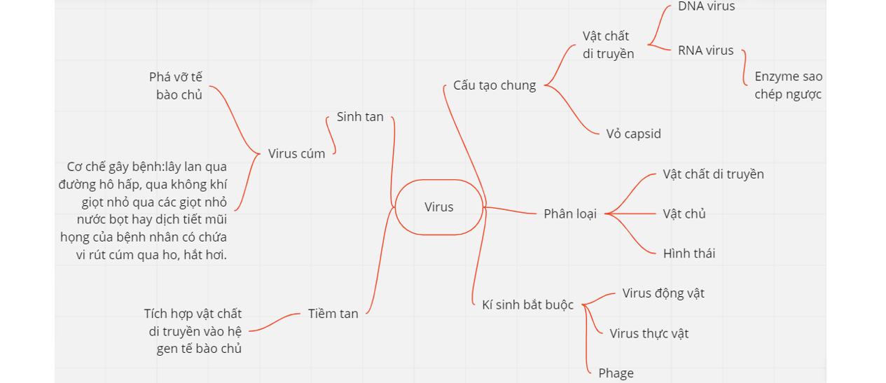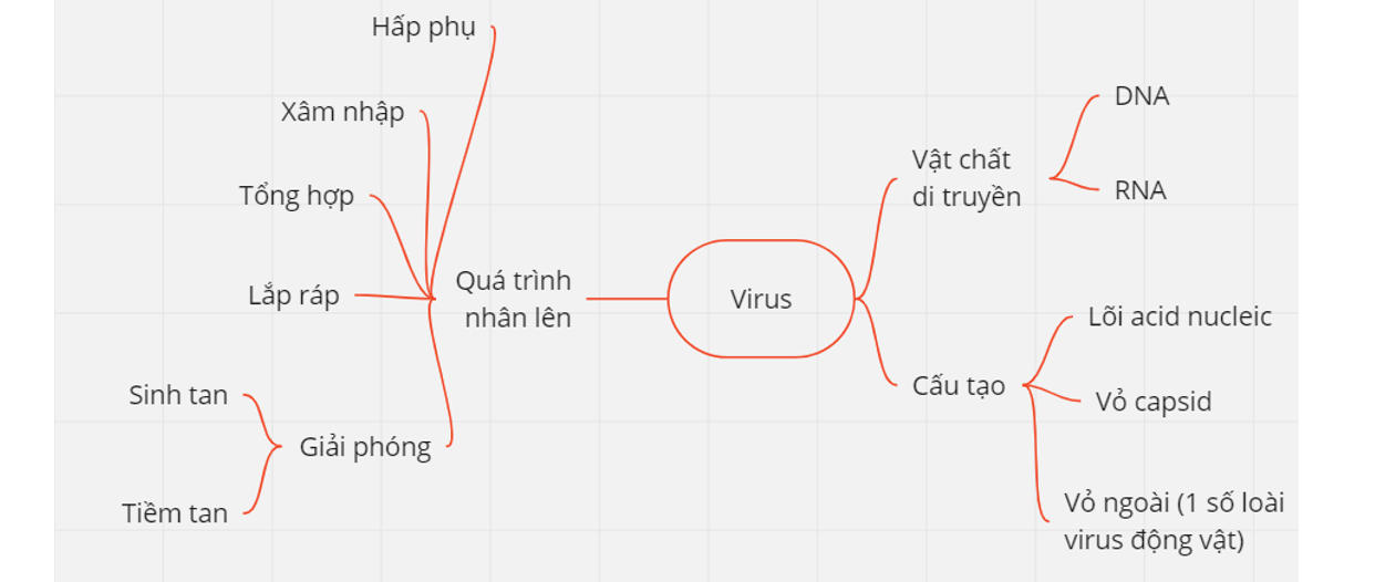 Vẽ bản đồ khái niệm với khái niệm sau đây: Virus, Vật chất di truyền, DNA, RNA, Vỏ capsid, Vỏ ngoài, Quá trình nhân lên, Hấp phụ, Xâm nhập, Tổng hợp, Lắp ráp, Giải phóng, Sinh tan, Tiềm tan.