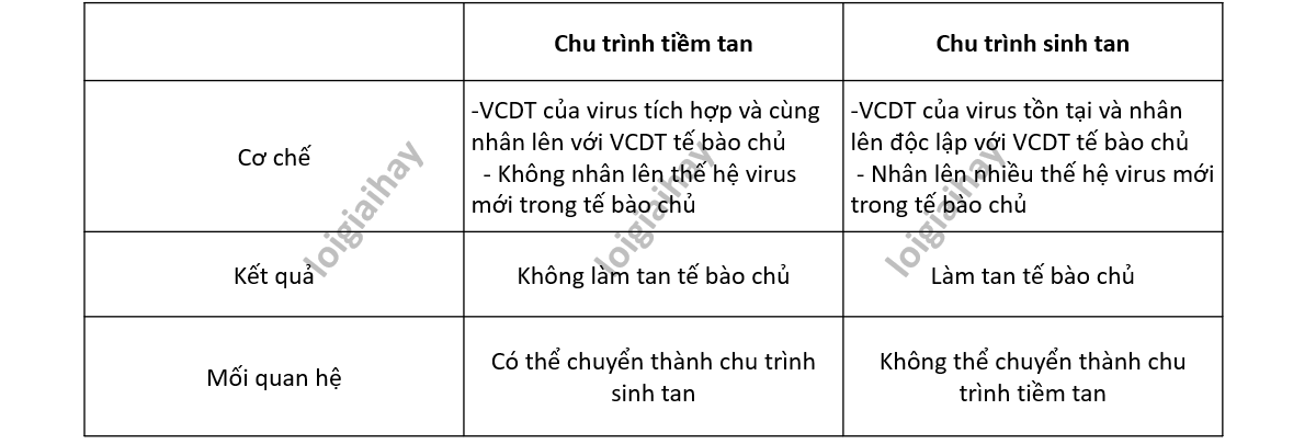 Chu trình tiềm tan và chu trình sinh tan của virus có đặc điểm khác biệt về cơ chế, kết quả của mỗi chu trình