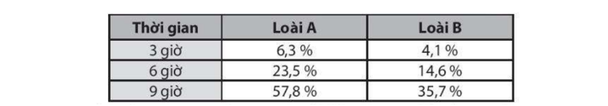 Để nghiên cứu về khả năng xâm nhiễm của một tác nhân gây bệnh đối với cơ thể sinh vật, một nhà khoa học đã tiến hành tiêm tác nhân gây bệnh X vào một loài thực vật A và một loài động vật B. Sau đó, ông quan sát trong nhiều giờ. Tỉ lệ phần trăm tế bào bị xâm lấn bởi tác nhân X được thống kê trong bảng bên dưới: