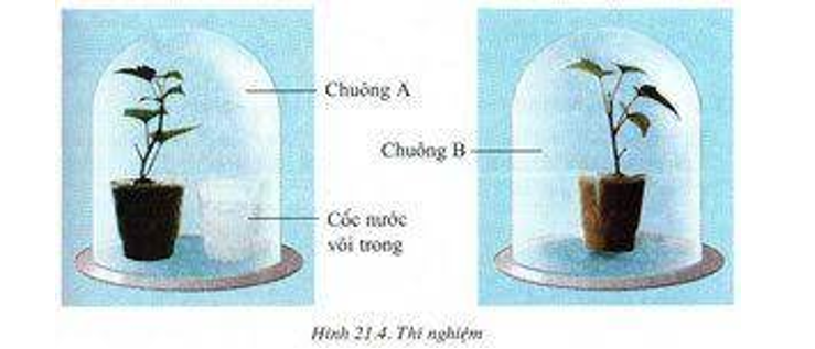 - Đặt mỗi cây lên một tấm kính ướt. Dùng hai chuông thủy tinh A và B úp ra ngoài mỗi chậu cây. Trong đó, ở chuông A cho thêm cốc nước chứa dung dịch nước vôi trong.