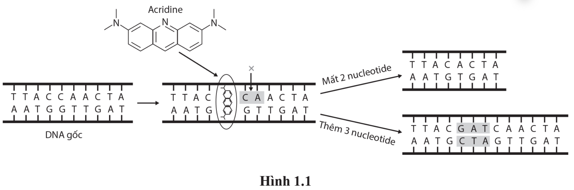 Quan sát hình 1.1 và mô tả cơ chế làm phát sinh đột biến của acridine.