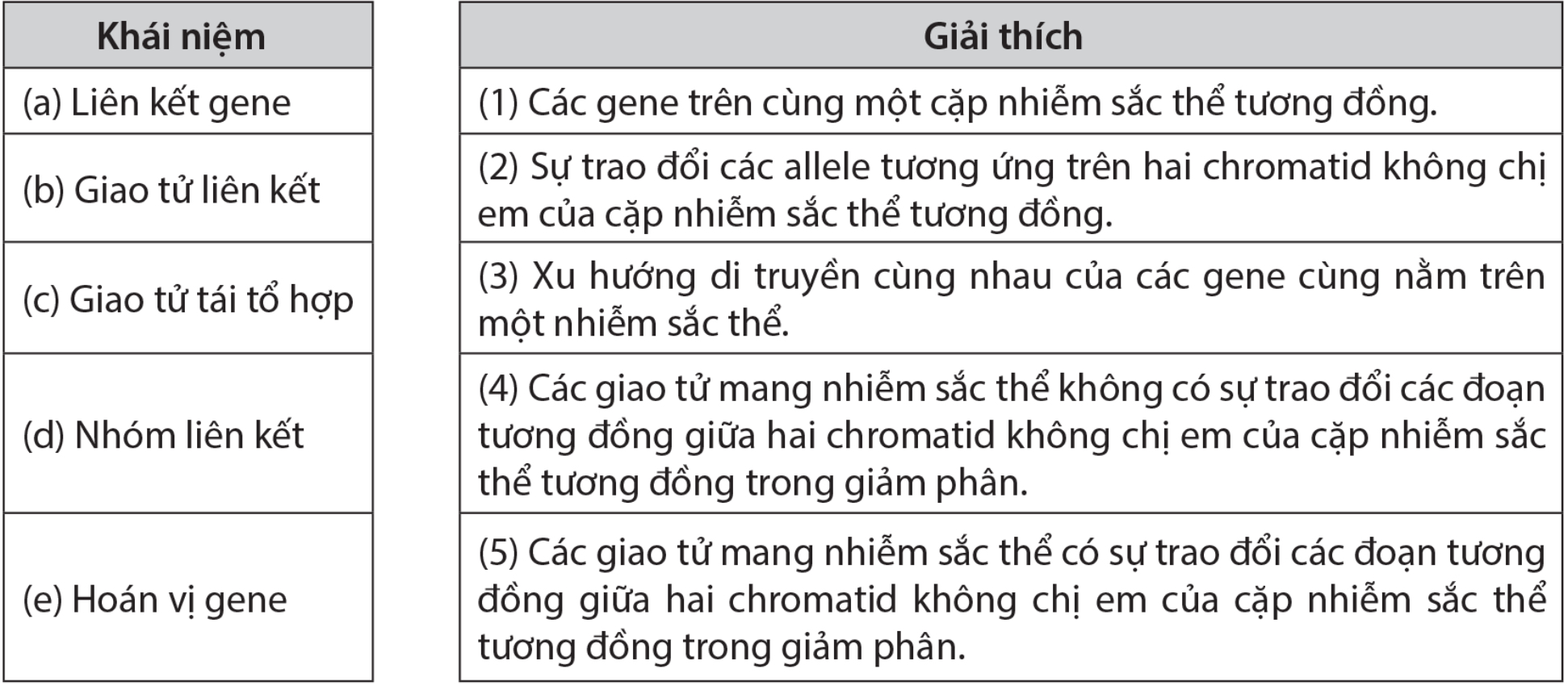 Viết các loại giao tử tái tổ hợp, giao tử không tái tổ hợp khi mỗi cá thể có kiểu gene AB/ab; Ab/aB giảm phân tạo giao tử.