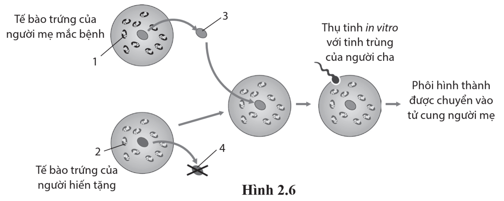 Khi sử dụng phương pháp “ba cha mẹ”, nhân của tế bào trứng của mẹ được tách và chuyên sang tế bào trứng của người hiển ¡tặng chỉ chứa các tì thẻ mang gene lành. Các ti thể mang gene đột biên gây bệnh ở tế bào trứng của người mẹ bị loại bỏ. Hợp tử hình thành do thụ tinh giữa tế bào trứng không mang gene đột biến và tinh trùng sẽ mang gene lành. Bệnh di truyền do gene ti thê đột biên bị ngăn chặn. Nếu gene đột biến năm trong nhân tế bào sẽ vẫn được truyền cho hợp tử. Do đó, phương pháp “ba cha mẹ” không ngăn chặn được bệnh di truyền do đột biến gene nhân.