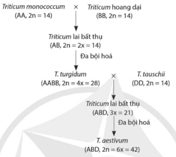 Trong một nghiên cứu, nhà khoa học khi tìm hiếu bộ nhiễm sắc thể của loài lúa mì Triticum aestivum hiện được trồng trên thế giới đã nhận thấy rằng: Bộ nhiễm sắc thể của cây lúa mì ở trạng thái lục bội có 42 nhiễm sắc thể, hình thành từ ba bộ nhiễm sắc thể lưỡng bội của các loài tổ tiên Triticum monococcum (14 nhiễm sắc thể, kí hiệu AA), loài Triticum hoang dại (14 nhiễm sắc thể, kí hiệu BB) và loài Triticum tauschii (14 nhiễm sắc thể, kí hiệu DD). Trong đó, con lai của hai loài Triticum monococcum và Triticum hoang dại là loài Triticum turgidum lai với loài Triticum tauschii trực tiếp hình thành nên loài lúa mì Triticum aestivum hiện nay. Giải thích cơ chế hình thành loài lúa mì Triticum aestivum. Một số giông lúa mì Triticum aestivum chỉ có 40 nhiêm sắc thê. Giải thích sự hình thành các giống này.