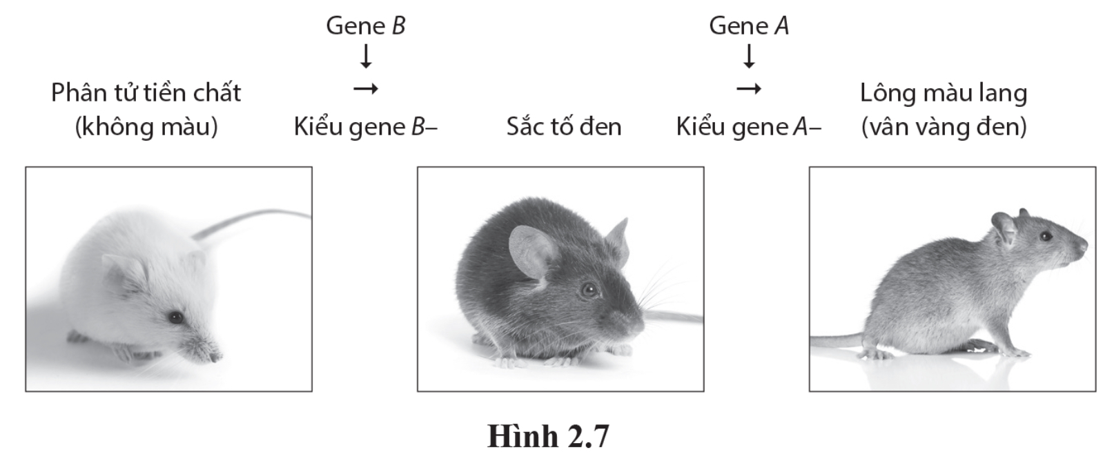 Hình 2.7 mô tả tương tác giữa các sản phẩm của các gene không allele hình thành màu lông ở chuột.