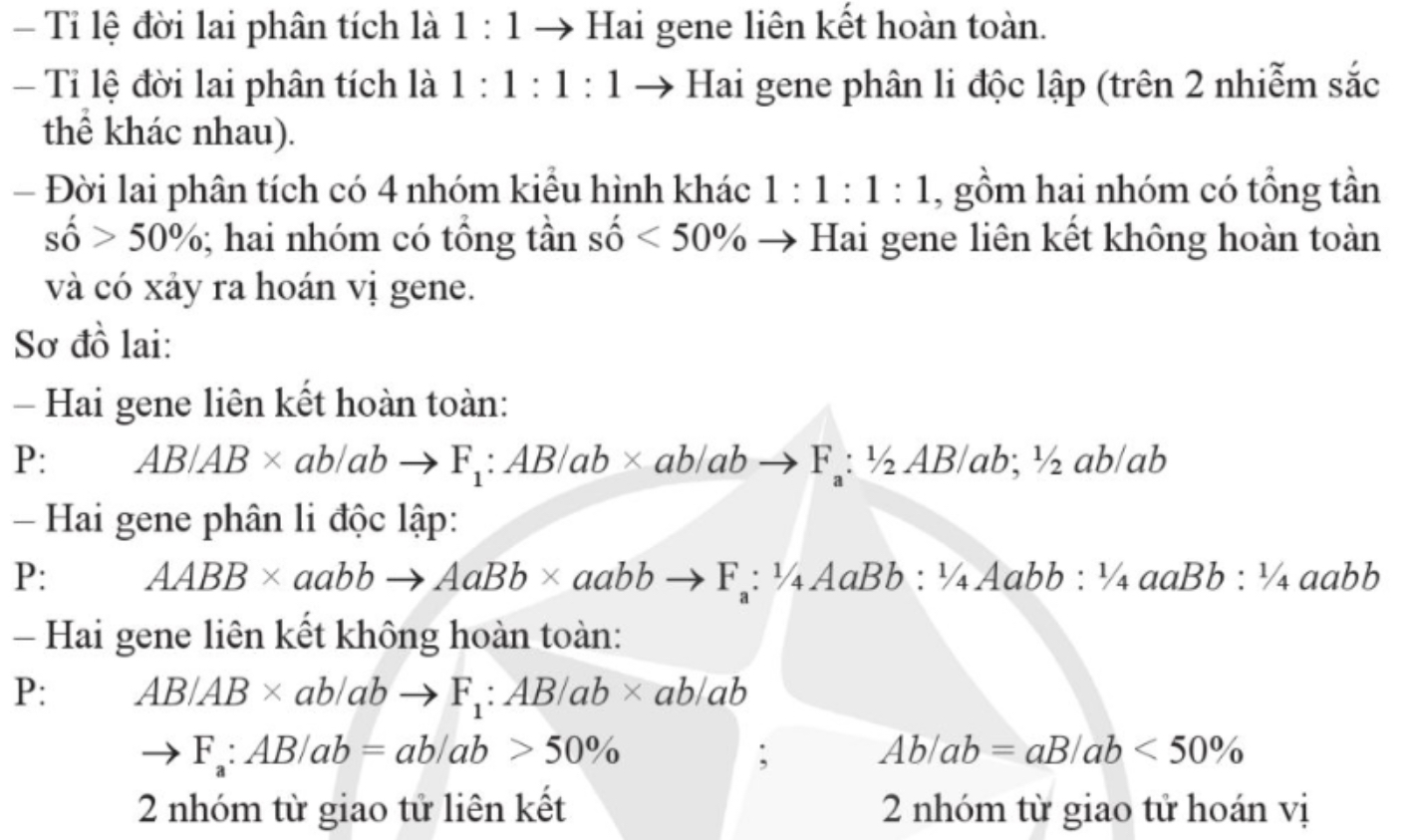 Khi lai hai dòng thuần chúng, khác nhau về hai tính trạng được quy định bởi hai gene khác nhau, F, có kiêu gene dị hợp tử về hai gene đó. Lai phân tích cá thê F,có kiêu gene dị hợp tử (với cá thê đồng hợp tử lặn về hai gene). đời lai phân tích có thê có các trường hợp sau: