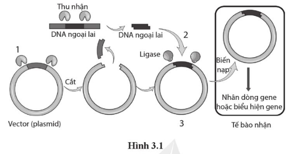 Hình 3.1 mô tả sơ đồ công nghệ DNA tái tổ hợp. Các số 1, 2 và 3 trong hình thể hiện nội dung nào sau đây?