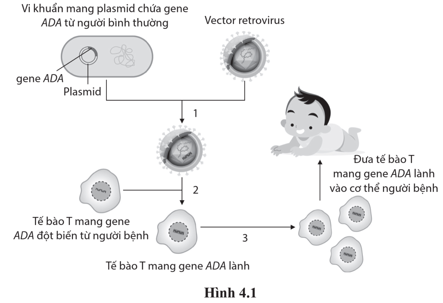 1: Gene ADA lành được đưa vào retrovirus, 2: Retrovirus xâm nhiễm vào tế bào T, chuyển gene ADA lành vào tế bào, 3: Nuôi cấy tế bào T mang gene ADA lành.
