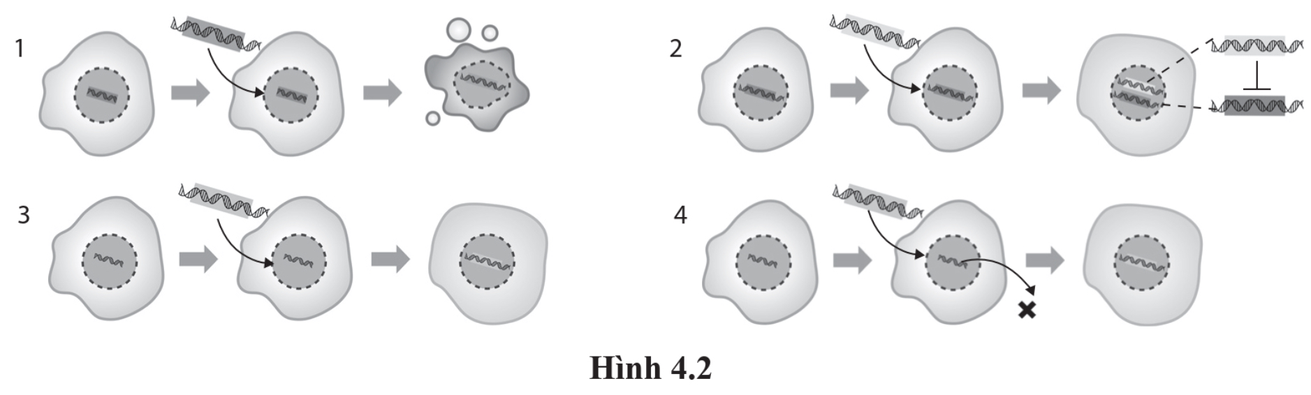 1: Đưa gene gây chết vào tế bào, 2: Đưa gene ức chế vào tế bào, 3: Đưa gene lành vào tế bào, 4: Đưa gene chỉnh sửa vào tế bào.