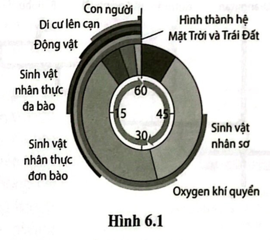 Nếu chúng at vẽ lại dòng thời gian dưới dạng một vòng tròn trên thang thời gian 1giờ (hình 6.1), động vật xuất hiện cách đây khoảng 9phút, trong khi con người xuất hiện cách đây tí hơn 02, giây. Vậy sinh vật nhân sơ xuất hiện cách đây bao nhiêu thời gian?