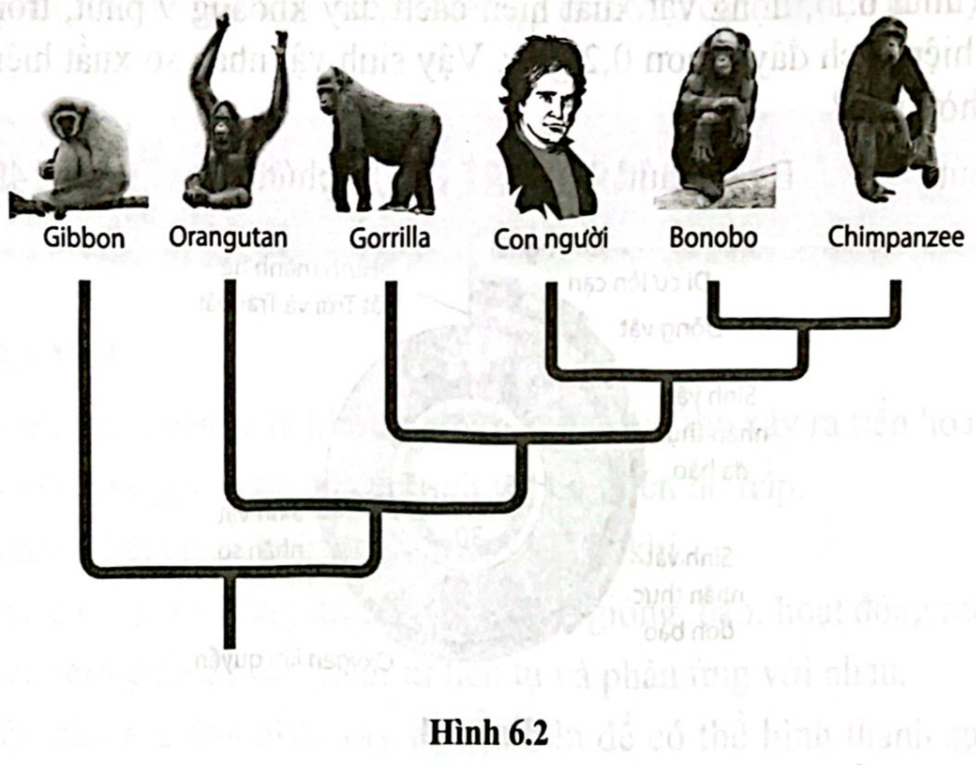 Dựa theo cây phát sinh chủng loại (hình 6.2), sinh vật có họ hàng gần gũi nhất với con người là: