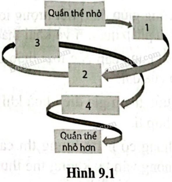 Trong bảo tồn đa dạng sinh học, các nhà sinh học tập trung vào bảo tồn ở mức quần thể và loài theo hai cách tiếp cận chính: tiếp cận quân thể nhỏ và tiếp cận quần thể đang suy giảm. Một quần thể nhỏ dễ bị cuốn vào vòng xoáy tuyệt chủng khiến kích thước ngày càng nhỏ đi tới khi không còn cá thể nào tồn tại. Quan sát hình 9.1 và cho biết thứ tự chính xác của các quá trình dân đên vòng xoáy tuyệt chủng của quần thể nhỏ.