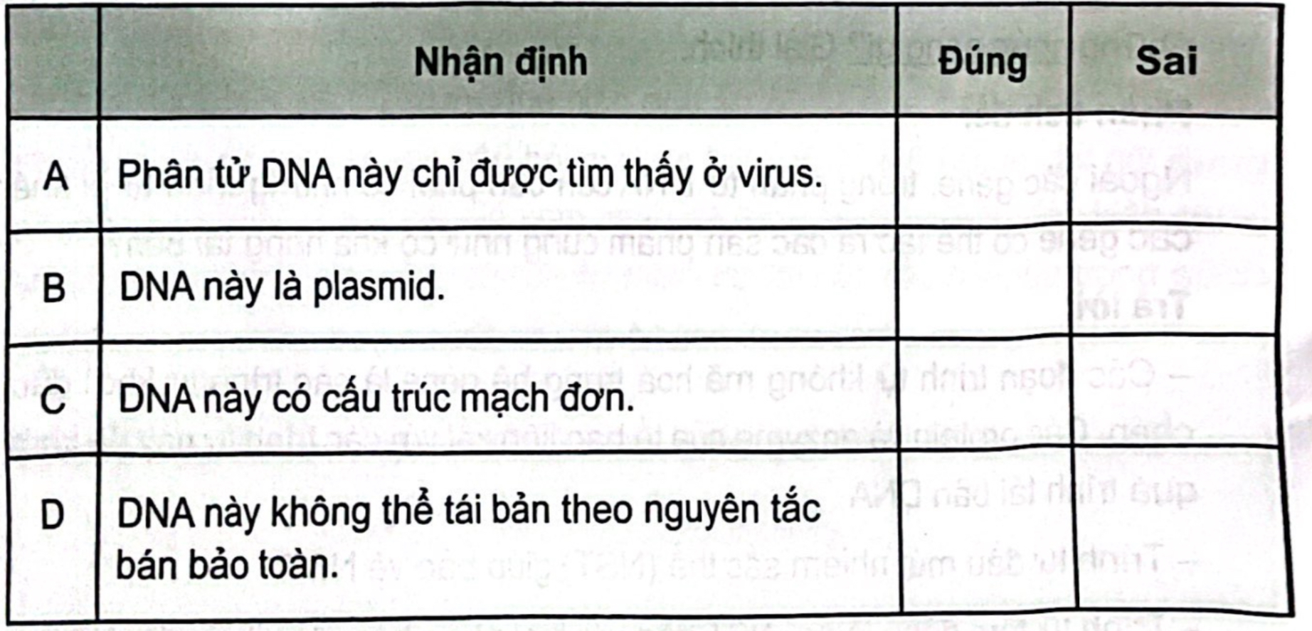 Một phân tử DNA có thành phần các nucleotide như sau: A=25%; T= 33%; G = 24%; C = 18%. Nhận định nào về phân tử DNA này là đúng? Nhận định nào sai? (đánh dấu x vào ô tương ứng trong bảng).