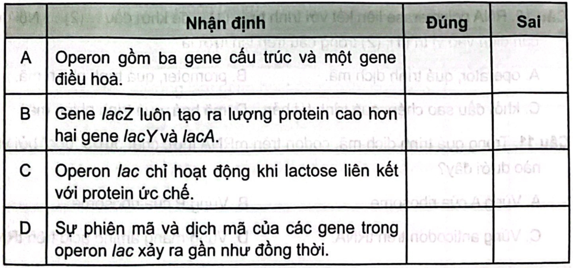 Nhận định nào về operon lac dưới đây là đúng? Nhận định nào sai? (đánh dấu xvào ôtương ứng trong bảng).