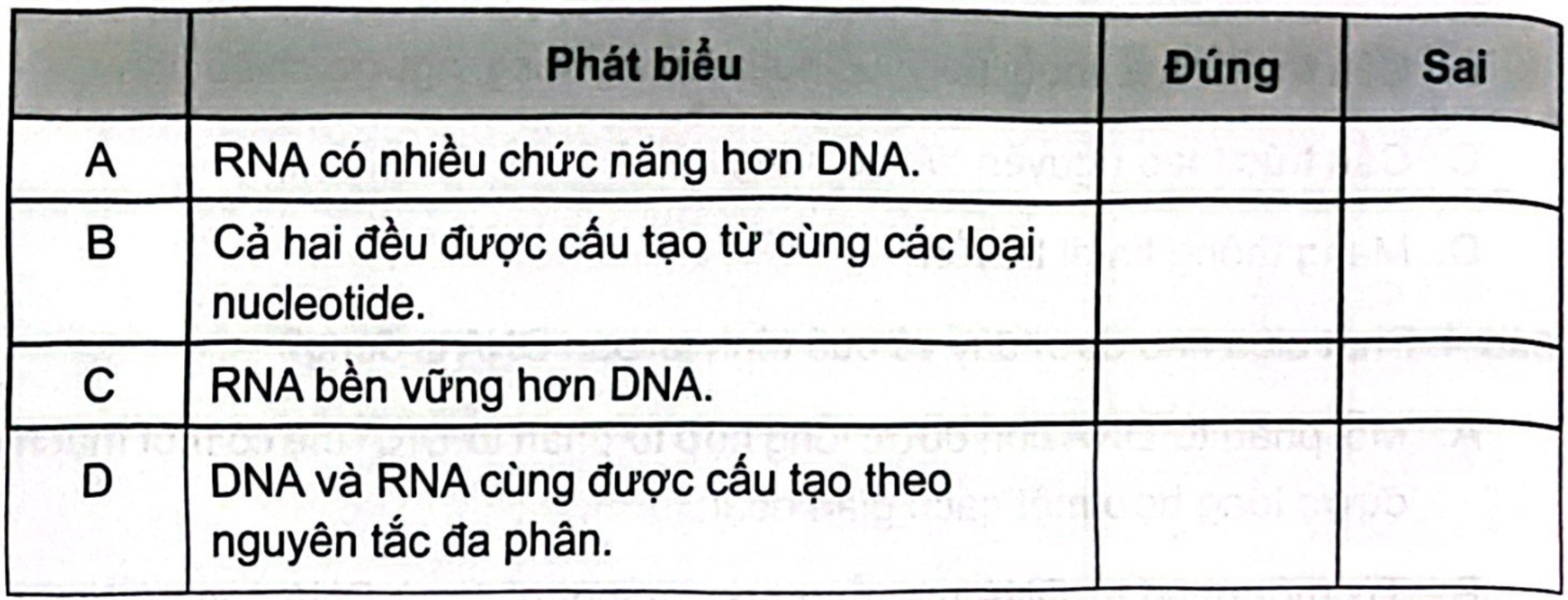 Phát biểu nào dưới đây về các đặc điểm của phân tử DNA và RNA là đúng? Phát biểu nào sai? (đánh dầu x vào ô tương ứng trong bảng).