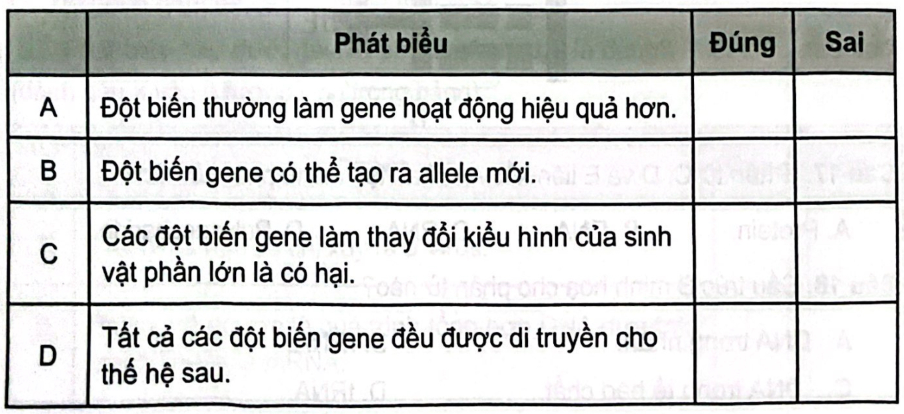 Phát biểu nào dưới đây về đột biến gene là đúng? Phát biểu nào sai? (đánh dấu x vào ô tương ứng trong bảng).