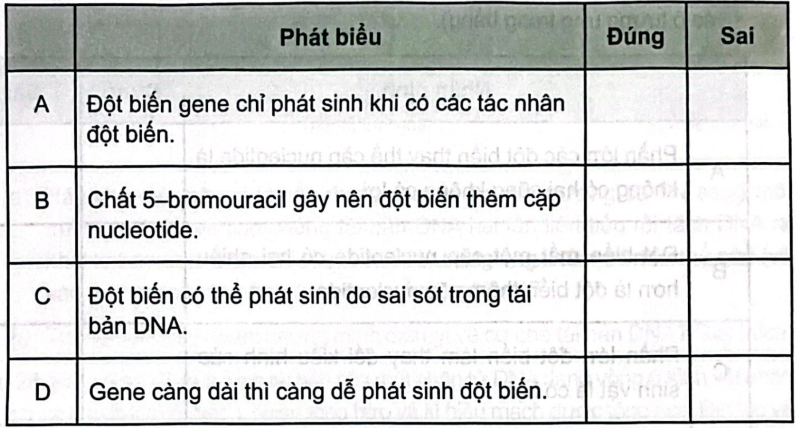 Phát biểu nào dưới đây về cơ chế phát sinh đột biển gene là đúng? Phát biểu nào sai? (đánh dấu xvào ô tương ứng trong bảng).