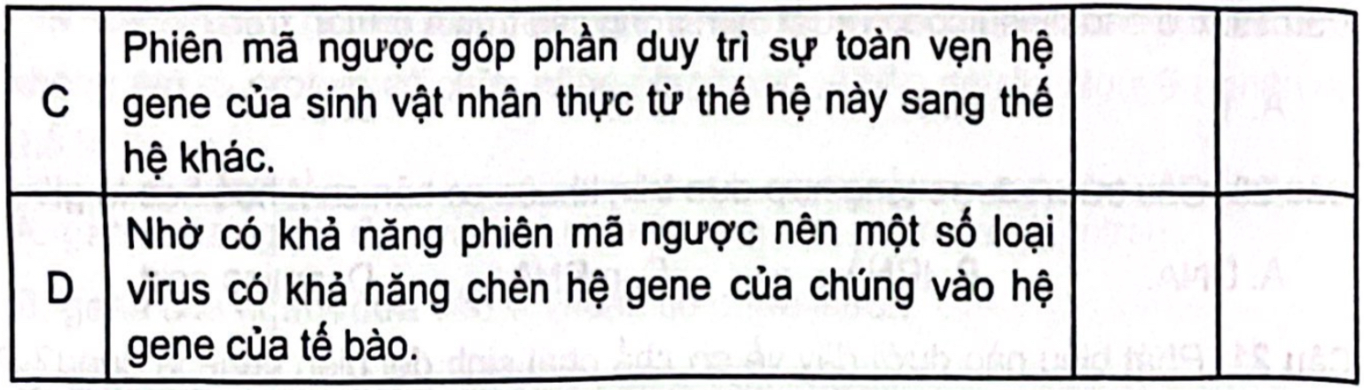 Phát biểu nào dưới đây về phiên mã ngược là đúng? Phát biểu nào sai? (đánh dấu x vào ô tương ứng trong bảng).