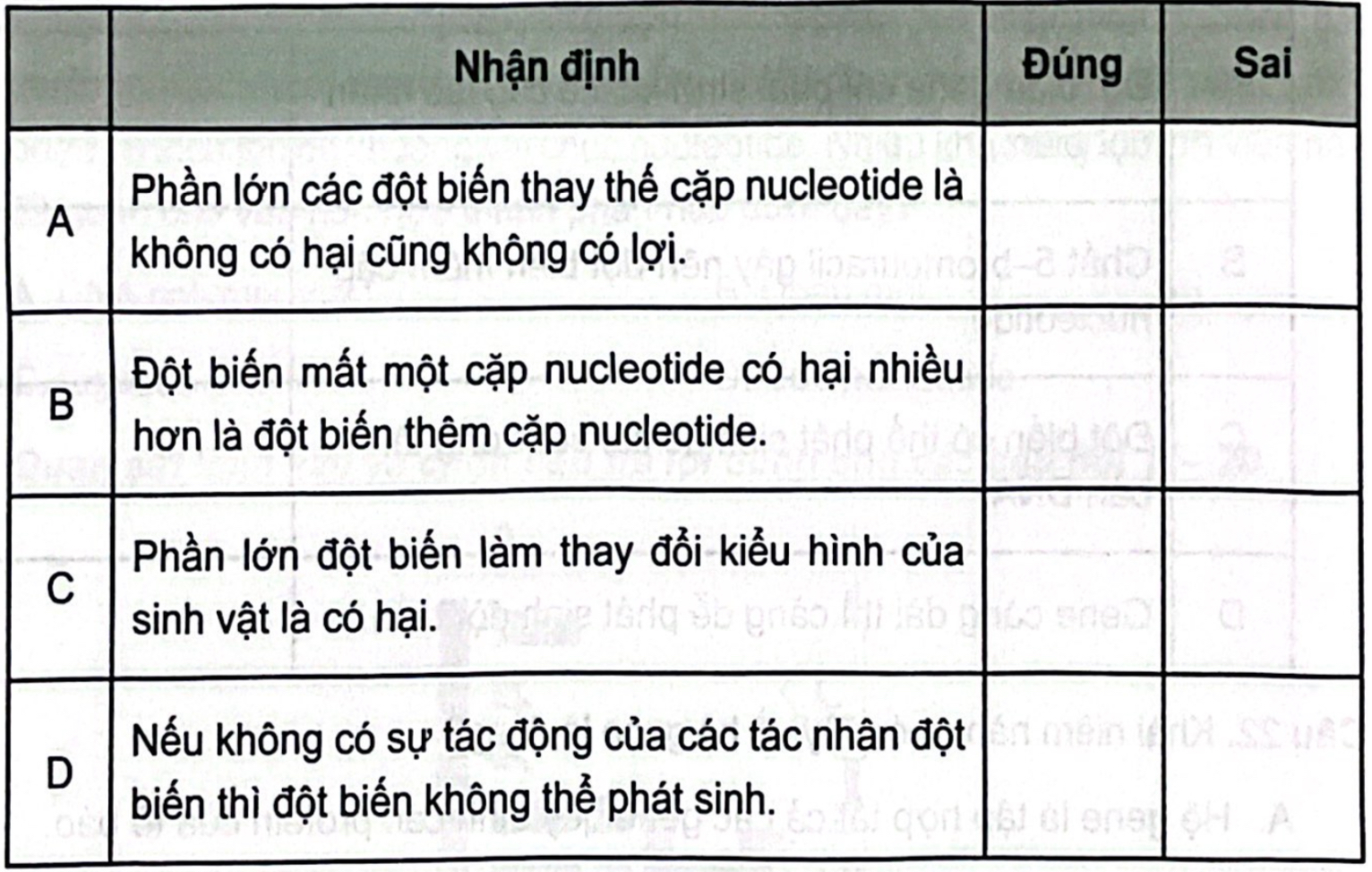Nhận định nào về đột biến dưới đây là đúng? Nhận định nào sai? (đánh dấu xvào ôtương ứng trong bảng).