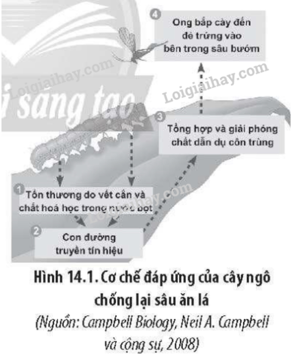 Hình 14.1 cho thấy phản ứng của cây ngô chống lại sâu ăn lá cây. Theo đó, lá ngô tổng hợp và giải phóng vào môi trường chất dẫn dụ ong bắp cày đến đẻ trứng vào bên trong sâu bướm. Ấu trùng sau khi nở ra từ trứng sẽ sử dụng chính sâu làm thức ăn, nhờ đó, sâu bị tiêu diệt.