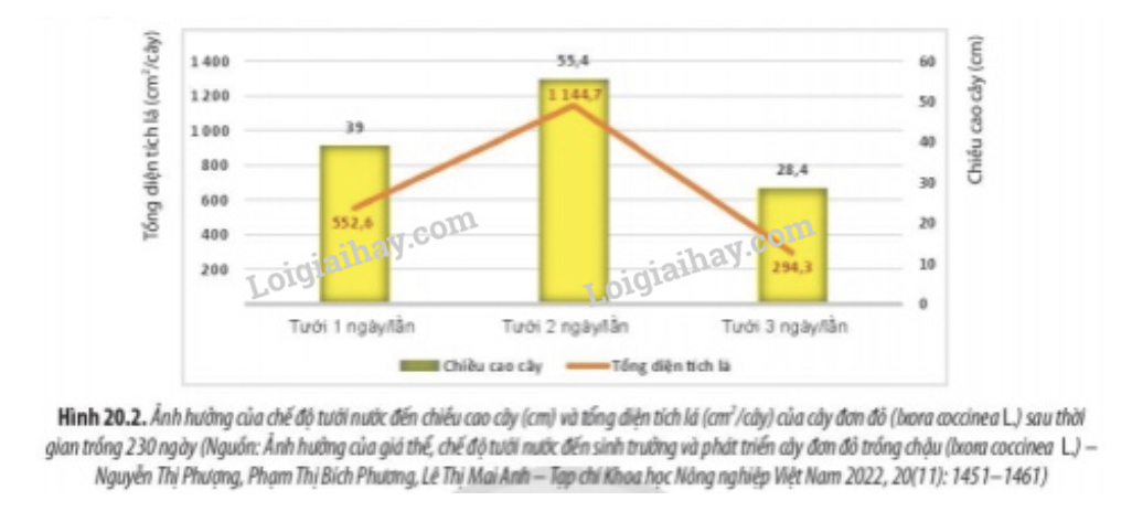 Dựa vào Hình 20.2 (SGK, trang 133), nếu lấy số liệu khi tưới 1 ngày/lần làm chuẩn, hãy tính tỉ lệ phần trăm so sánh về chiều cao cây và tổng diện tích lá của cây đơn đỏ khi tưới 2 ngày/lần và tưới 3 ngày/lần.