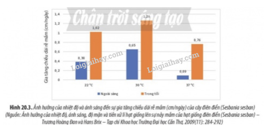 Dựa vào Hình 20.3 (SGK, trang 133), nếu lấy số liệu ở mức nhiệt độ 22°C làm chuẩn, hãy tính tỉ lệ phần trăm so sánh sự gia tăng chiều dài rễ mầm của cây điên điển ở các mức nhiệt độ 30 °C và 37 °C khi để ngoài sáng và trong tối.