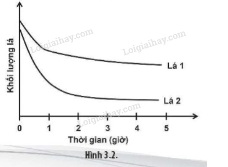 Trong một thí nghiệm người ta sử dụng lá của hai loài khác nhau với diện tích bề mặt và khối lượng lá bằng nhau. Các lá đều được đặt trong một phòng kín có cùng cường độ chiếu sáng và thời gian chiếu sáng như nhau. Trọng lượng của lá được ghi lại sau mỗi giờ thí nghiệm. Kết quả thí nghiệm thể hiện ở đồ thị Hình 3.2. Dựa vào đặc điểm cấu tạo của lá, hãy đưa ra ba giả thuyết để giải thích kết quả thí nghiệm trên.