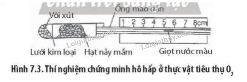 b) Vôi xút có tác dụng hấp thụ CO2 tạo ra từ quá trình hô hấp của hạt, nếu không dùng vôi xút → CO2 được sinh ra từ quá trình hô hấp của hạt sẽ làm tăng áp suất trong ống nghiệm → giọt nước màu không dịch chuyển hoặc có thể bị đẩy về bên phải của ống mao dẫn → khó quan sát được kết quả thí nghiệm → ý kiến của bạn học sinh là sai.