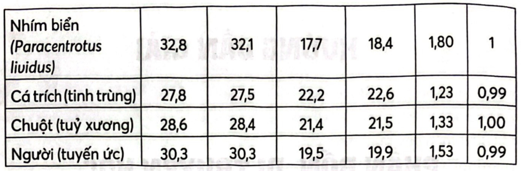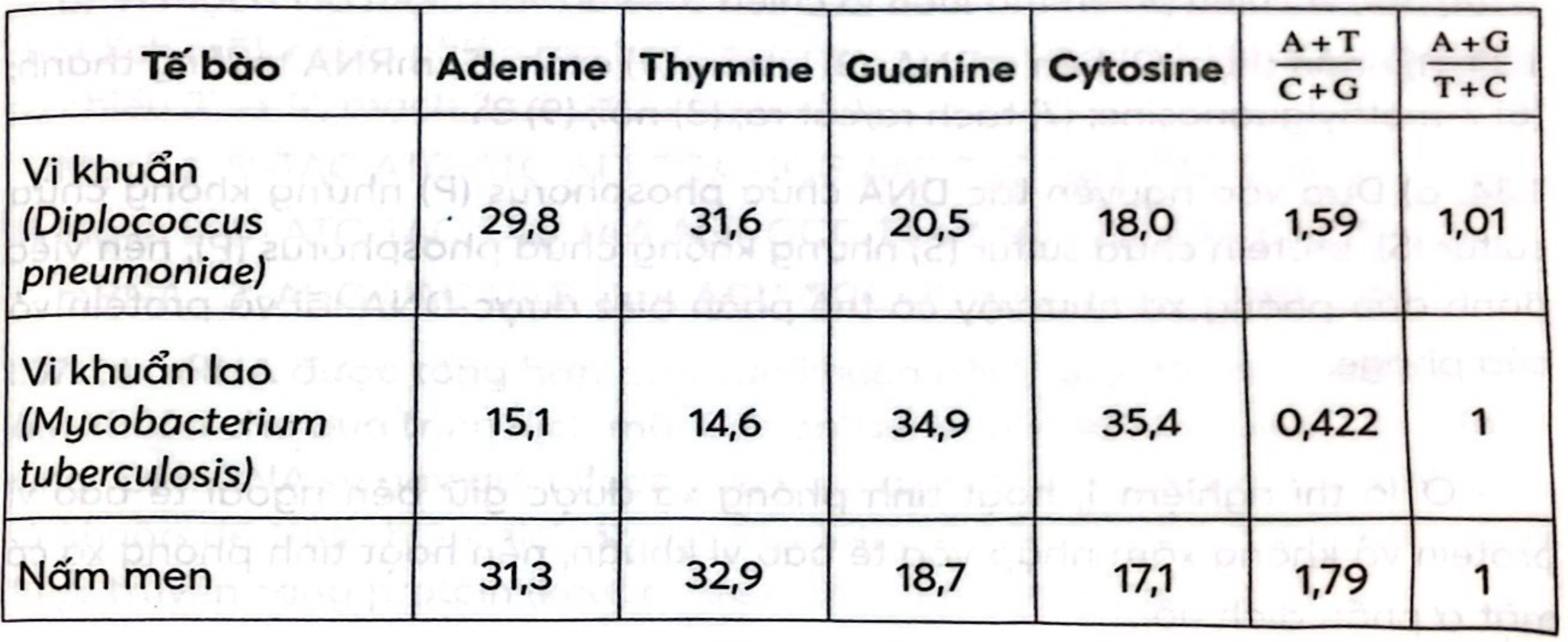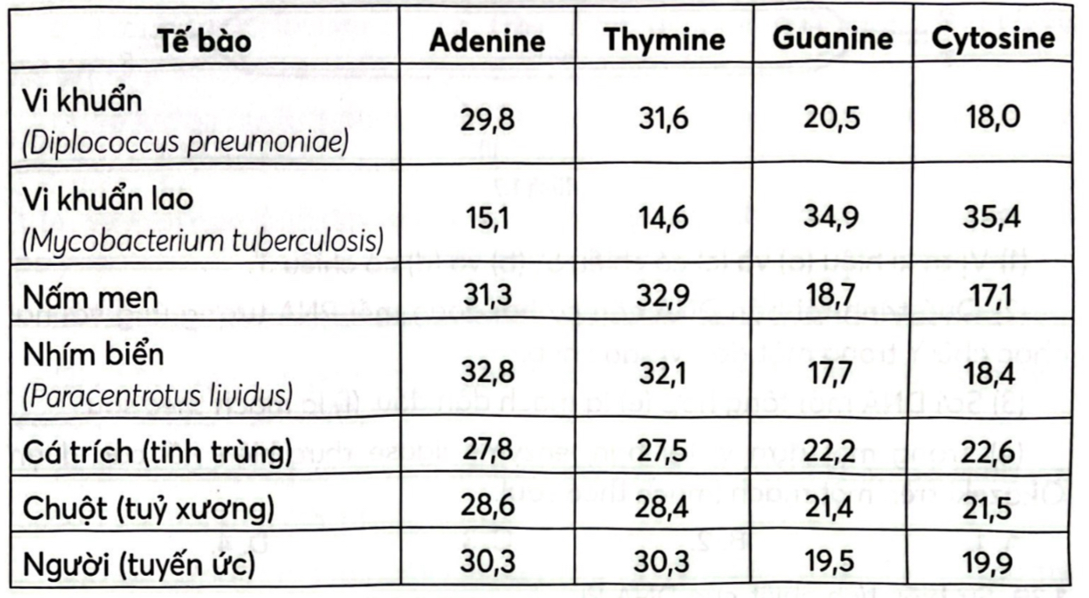 Khi nghiên cứu một lượng lớn DNA từ tế bào của các sinh vật khác nhau, Chargaff đã thu được số lượng từng loại nucleotide như bảng dưới đây.