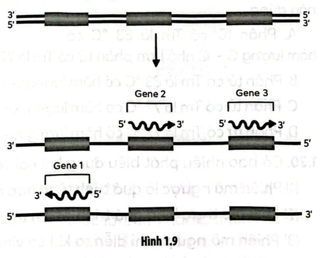 Quan sát thông tin trong Hình 1.9 về quá trình phiên mã, cho biết các phát biểu sau đây đúng hay sai. Giải thích.