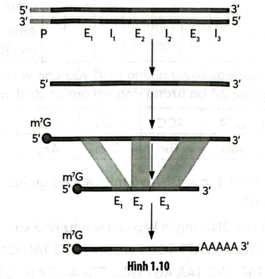 Quan sát thông tin minh họạ trong Hình 1.10 và điền các từ/cụm từ thích hợp vào chỗ trống của đoạn văn sau: Ở" sinh vật ...(1)..., quá trình phiên mã tạo ra phân tử ...(2)... có chứa cả đoạn ...(3)... (I) và ...(4)... (E), cần có quá trình biến đổi để tạo thành ...(5)... Ngay sau khi bắt đầu phiên mã, mũ ...(6)... được thêm vào đầu 5'. Tiếp theo, trong quá trình kéo dài phiên mã, các intron được ...(7)... và các exon được ...(8)... với nhau. Cuối cùng, đuôi poly-A được thêm vào đầu ...(9)... Ngoài ra, ở một số quá trình phiên mã của sinh vật nhân thực khác, đuôi poly-A có thể được thêm vào trước khi quá trình cắt intron, nối exon hoàn tất".