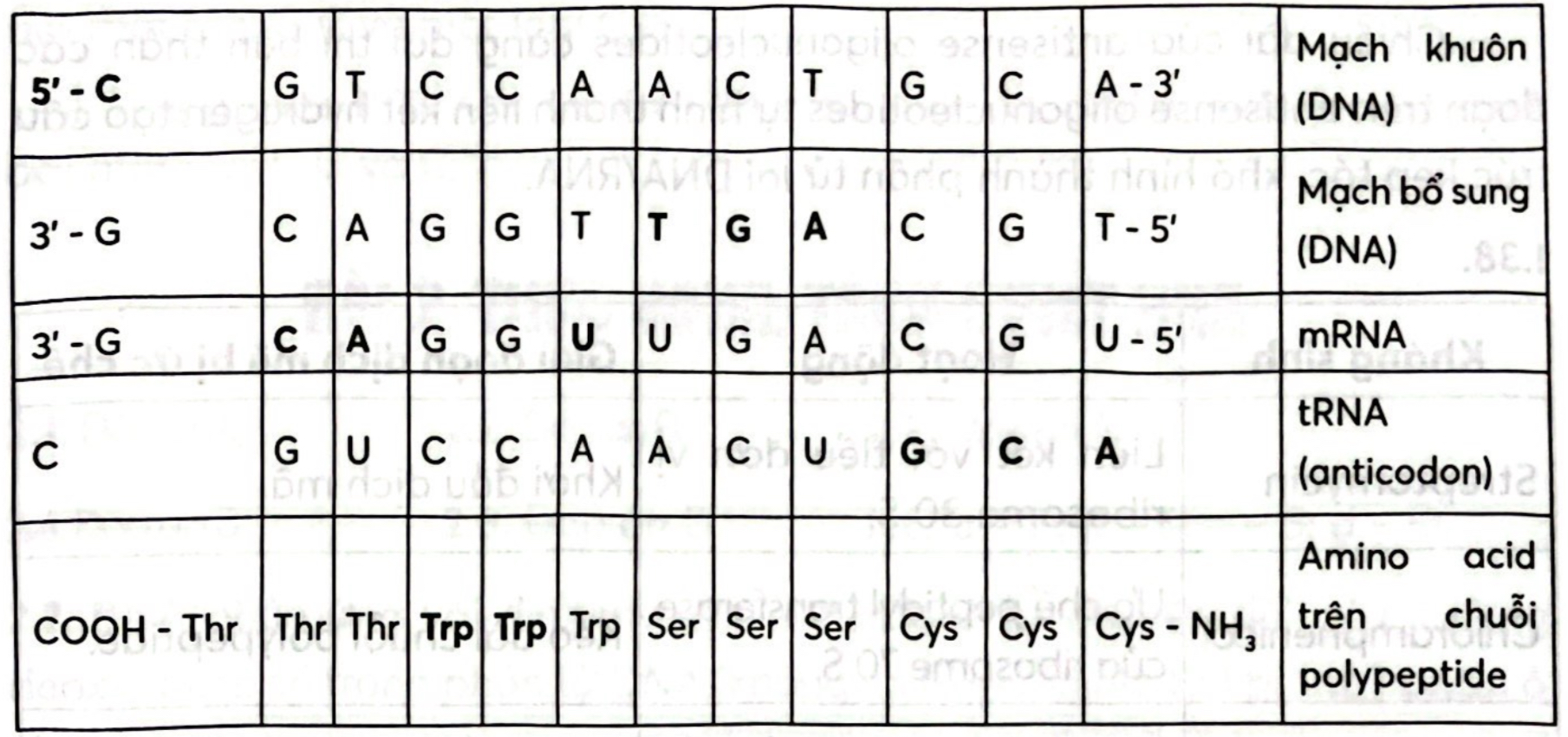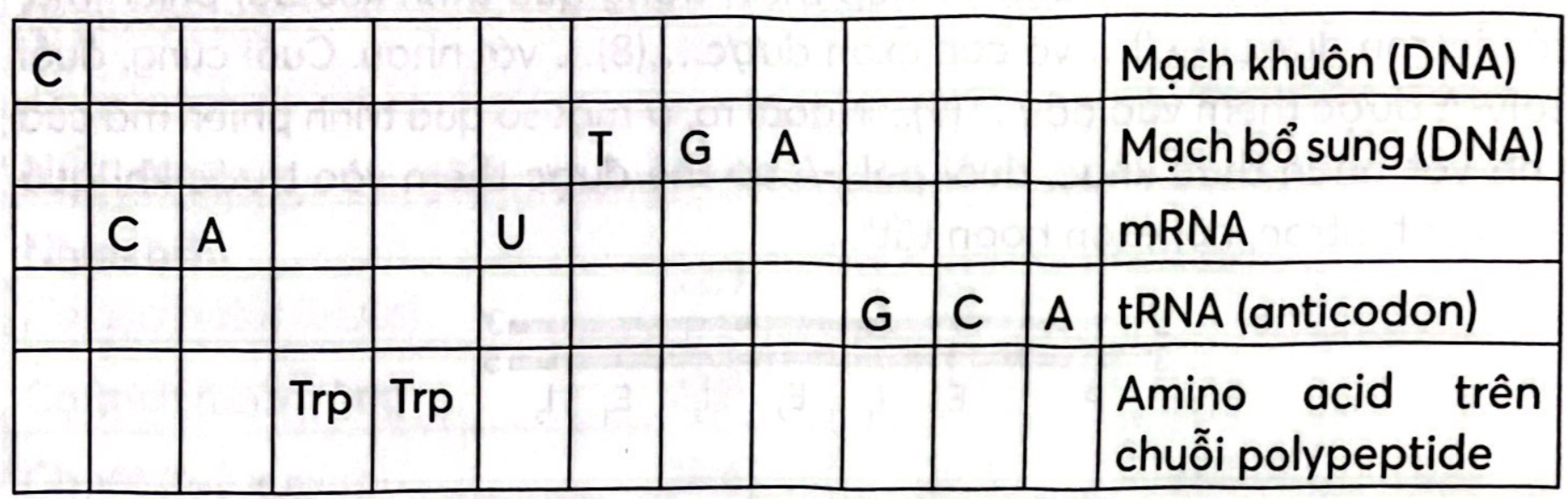 a) Hãy điền các nucleotide và amino acid vào các vị trí còn thiếu trong bảng trên, biết rằng các bộ ba tương ứng với amino acid là: