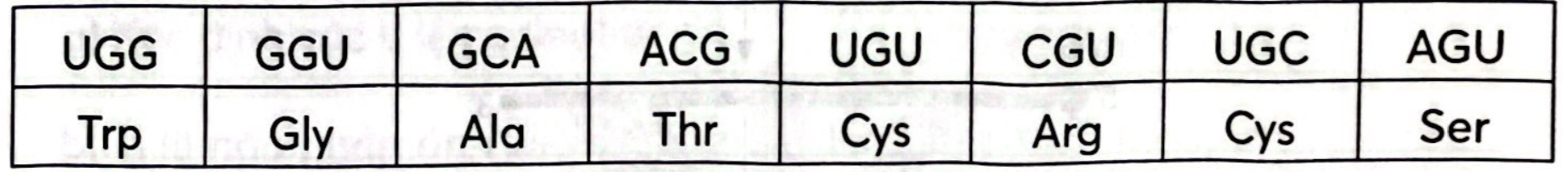 Hãy xác định mỗi loại amino acid được mã hóa bởi trình tự codon nào trên mRNA, biết rằng trình tự codon được viết theo công thức GmCn, với m, n là số lượng nucleotide G, C trong mỗi bộ ba.