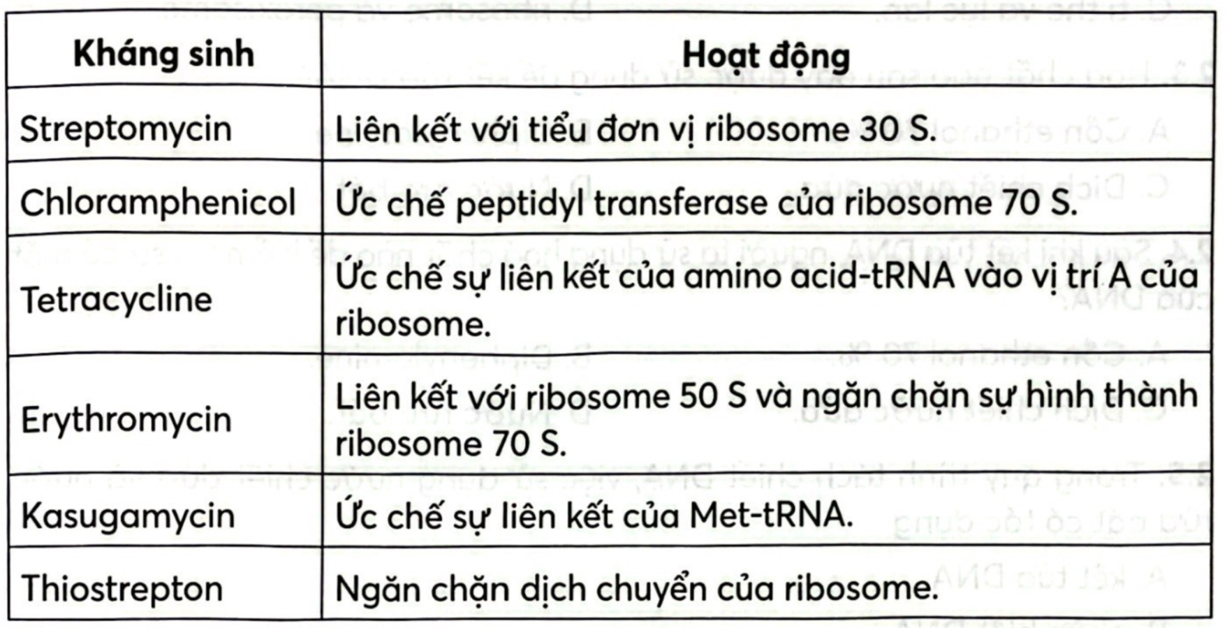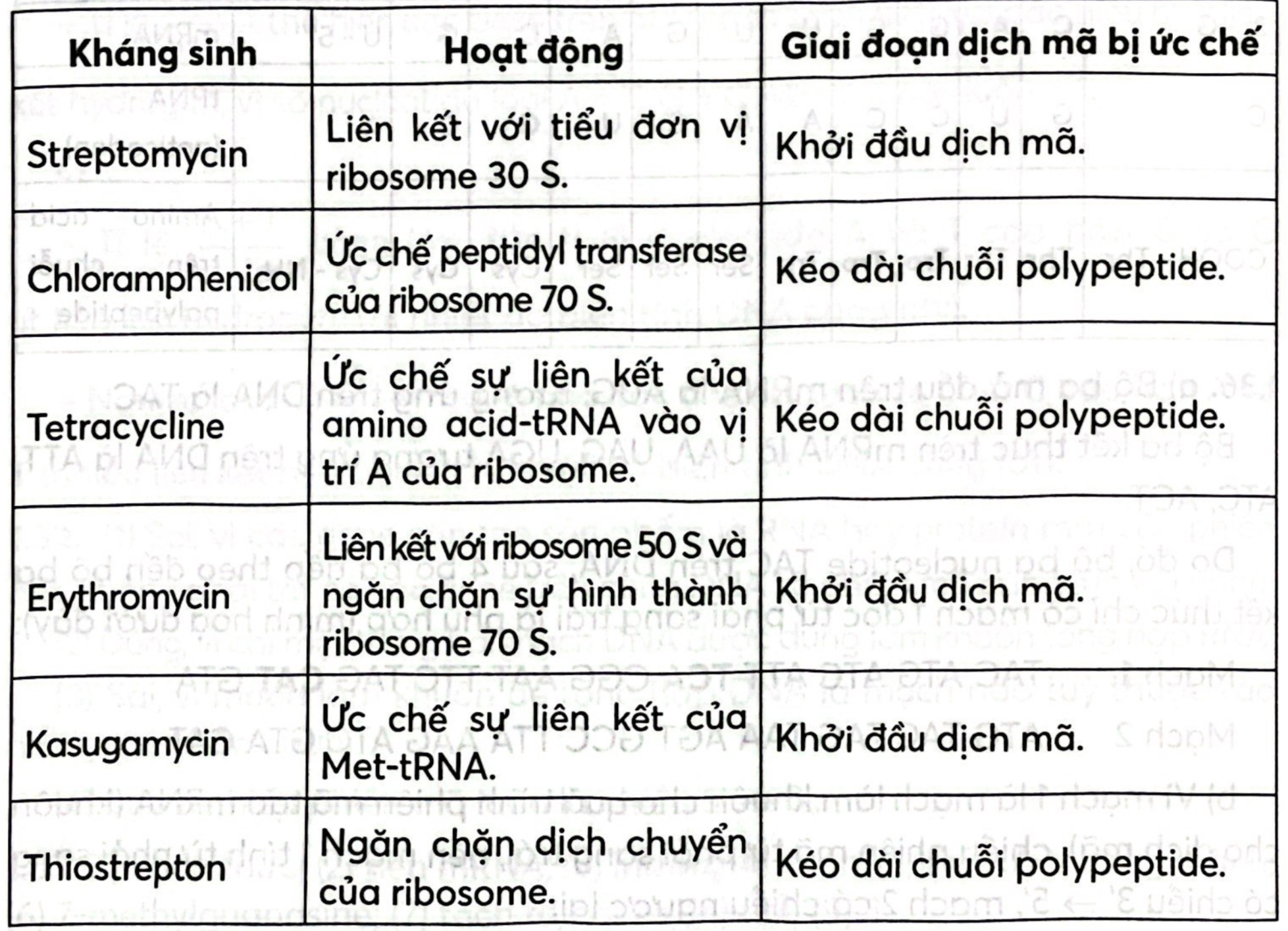 Nhiều loại kháng sinh có hiệu quả chống lại các bệnh nhiễm trùng do vi khuẩn nhờ ức chế sự tổng hợp protein trong tế bào vi khuẩn. Sử dụng thông tin được cung cấp trong bảng sau đây và xác định giai đoạn dịch mã nào bị ức chế tương ứng với mỗi loại thuốc: khởi đầu tổng hợp chuỗi polypeptide, kéo dài chuỗi polypeptide hoặc kết thúc.
