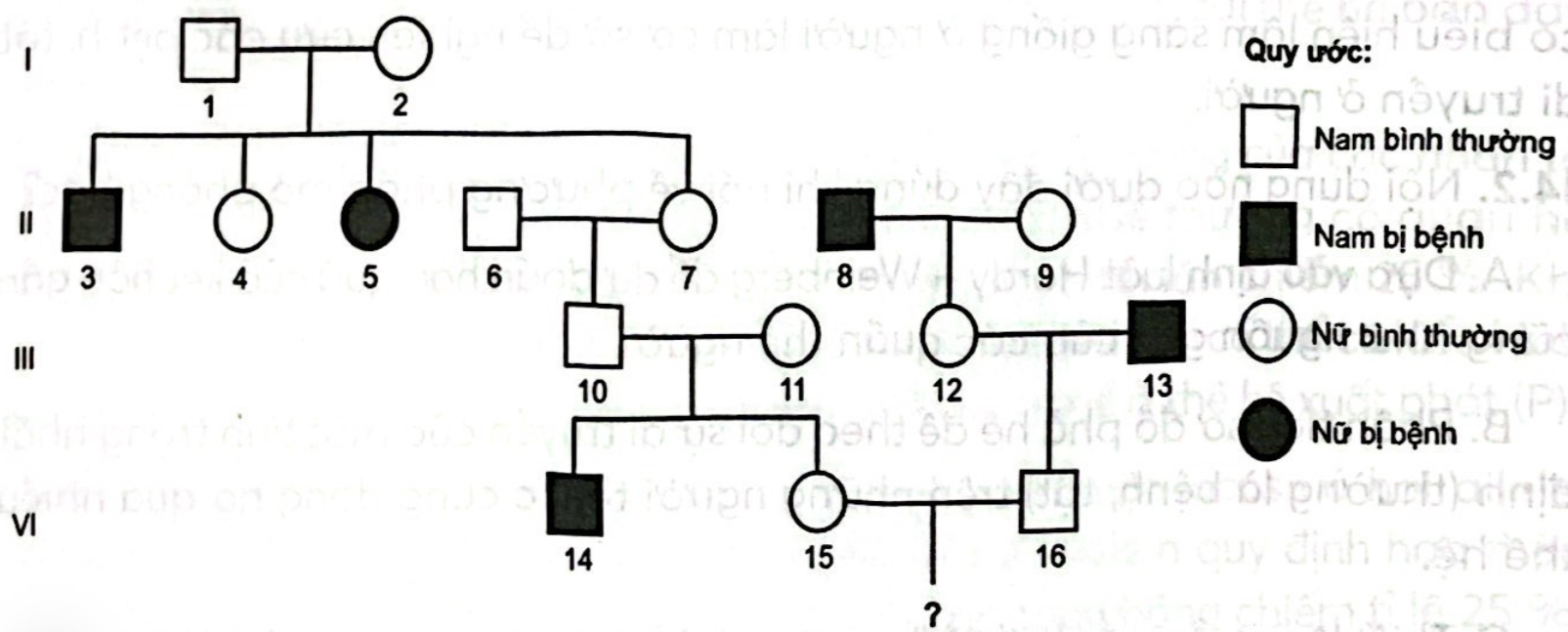 Nghiên cứu sự di truyền của một bệnh do một gene có hai allele quy định, năm ở vùng không tương đồng của nhiêm sắc thế giới tính X, ở một dòng họ, người ta thu được các thông tin sau: "Một cặp vợ chồng (quy ước M): chồng bị bệnh còn vợ bình thường. Họ sinh được ba người con: một người con gái bình thường, một người con trai bình thường và một người con trai bị bệnh. Người con trai bị bệnh của Mlấy vợ bình thường, sinh được ba người con: hai người con gái bình thường (quy ước là G1 và G2), một người con trai bị bệnh. Người con gái của Mlấy chồng bình thường, sinh được con gái