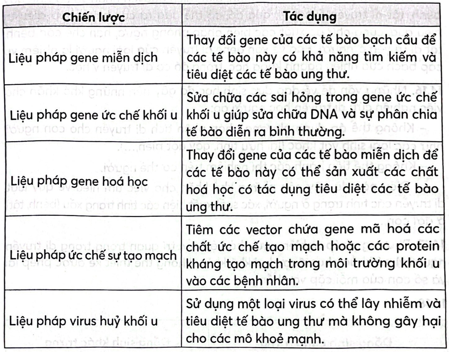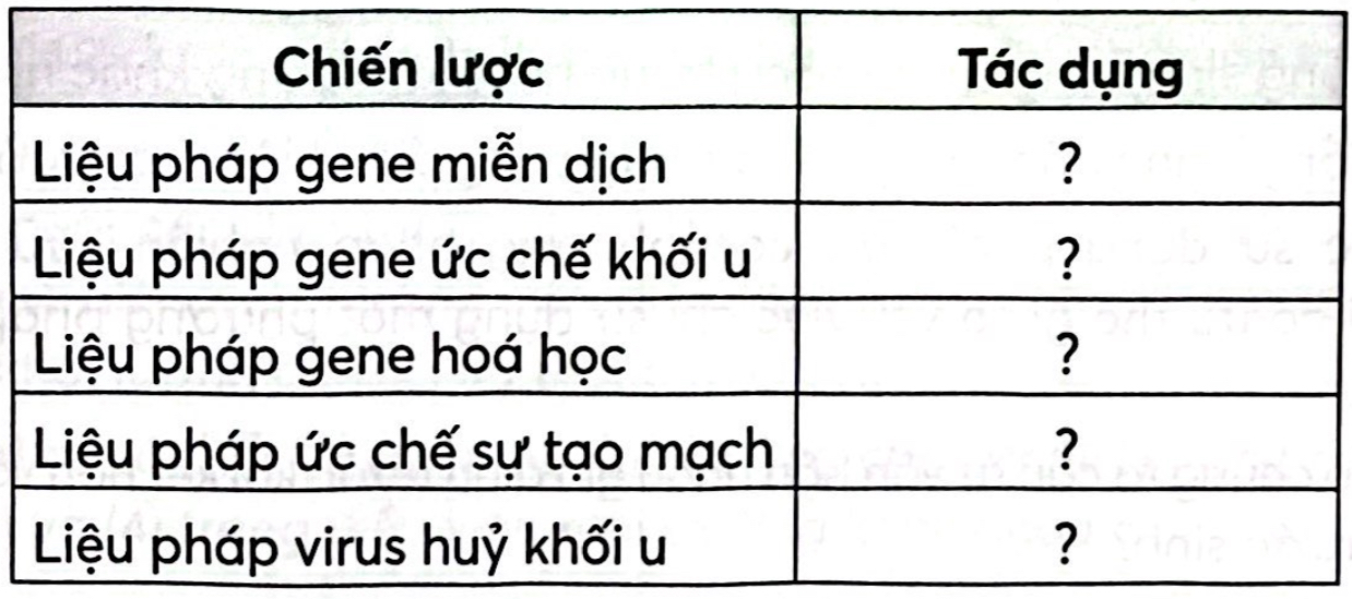 Hãy tìm hiểu và cho biết tác dụng của các chiến lược liệu pháp gene trong điều trị ung thư bằng cách hoàn thành bảng sau.