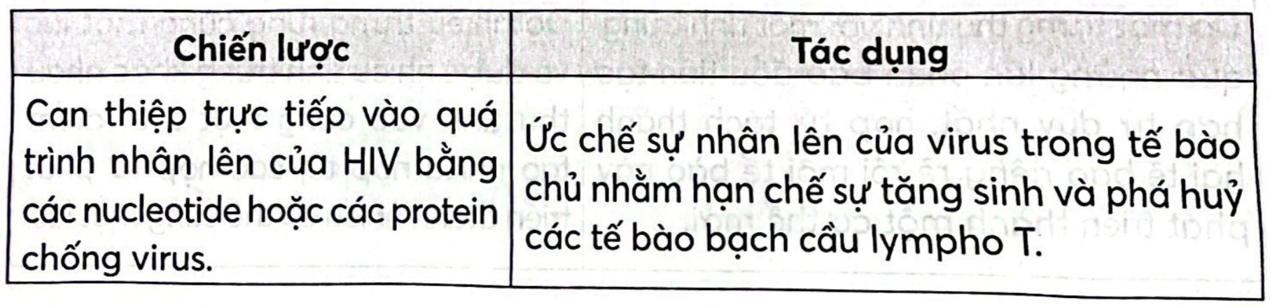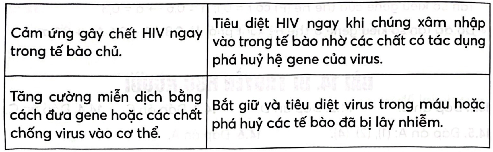 Hãy tìm hiểu và cho biết tác dụng của các chiến lược liệu pháp gene trong điều trị HIV/AIDS bằng cách hoàn thành bảng sau.