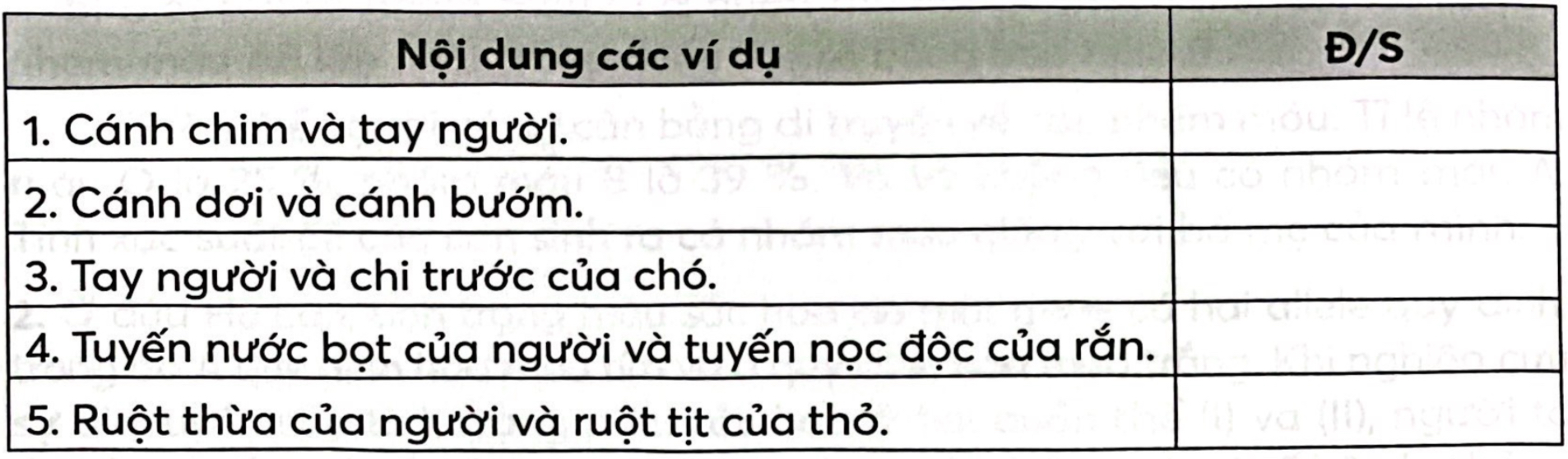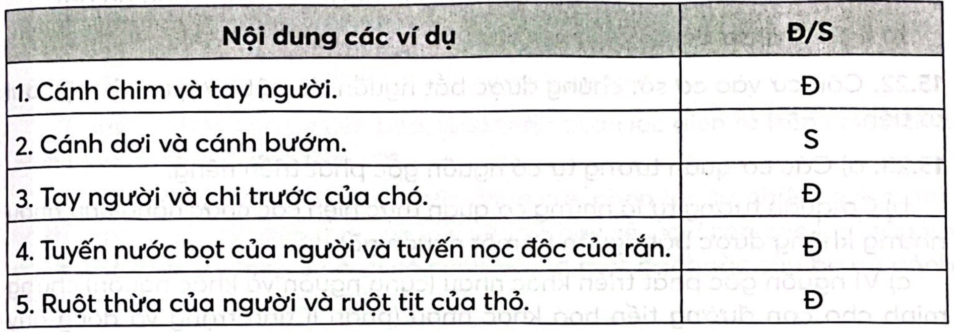 Những ví dụ sau đây là đúng hay sai khi nói về các cơ quan nằm ở vị trí tương ứng trên cơ thể sinh vật có cùng nguồn gốc trong quá trình phát triển phôi? Nếu đúng ghi Đ, sai ghi S vào cột tương ứng.