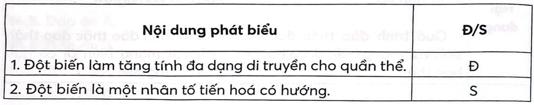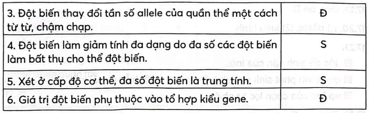 Những phát biểu sau đây là đúng hay sai khi nói về đặc điểm của đột biến? Nếu đúng ghi Đ, sai ghi S vào cột tương ứng.