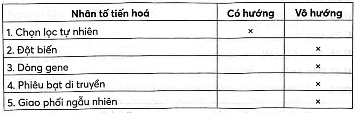 Xác định nhân tố tiến hóa vô hướng và nhân tố tiến hóa có hướng bằng cách đánh dấu x vào cột tương ứng.