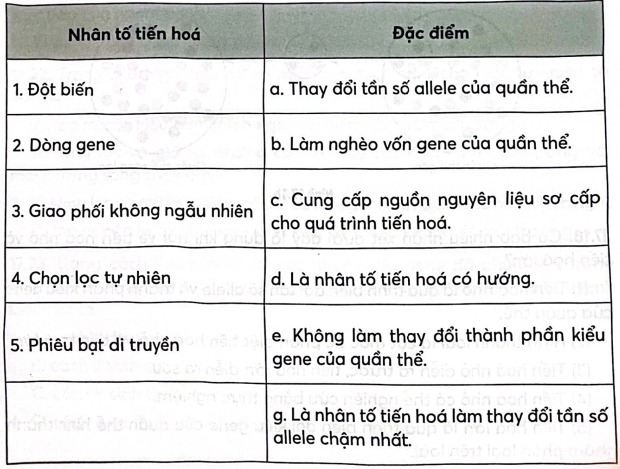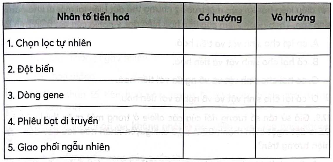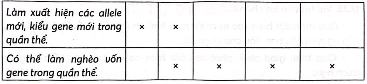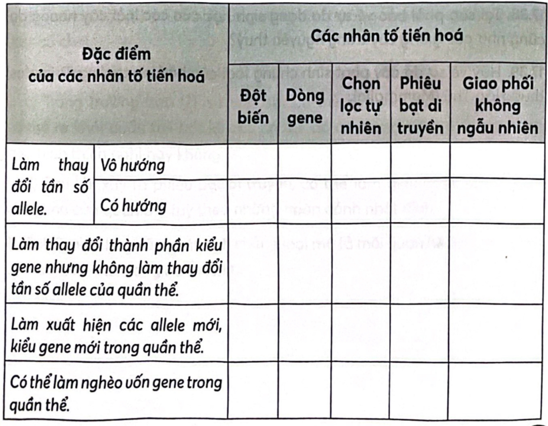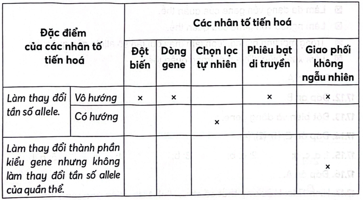 Đánh dấu x vào cột tương ứng để thể hiện đặc điểm của các nhân tố tiến hóa.