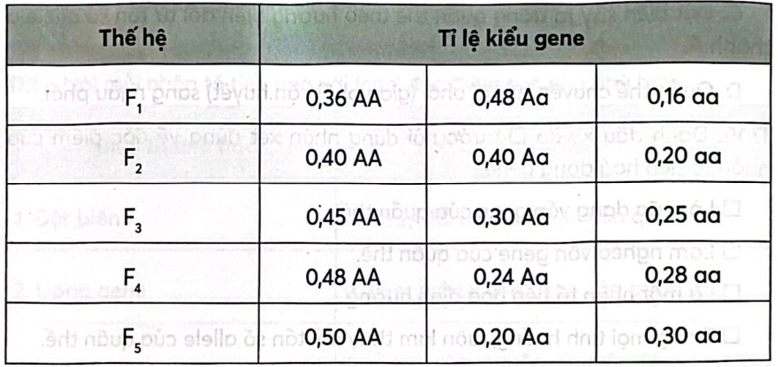Ở một quần thể, xét một gene nằm trên nhiễm sắc thể thường có hai allele A và a, trong đó allele A trội hoàn toàn so với allele a. Theo dõi sự biến đổi cấu trúc di truyền của quần thể qua năm thế hệ: