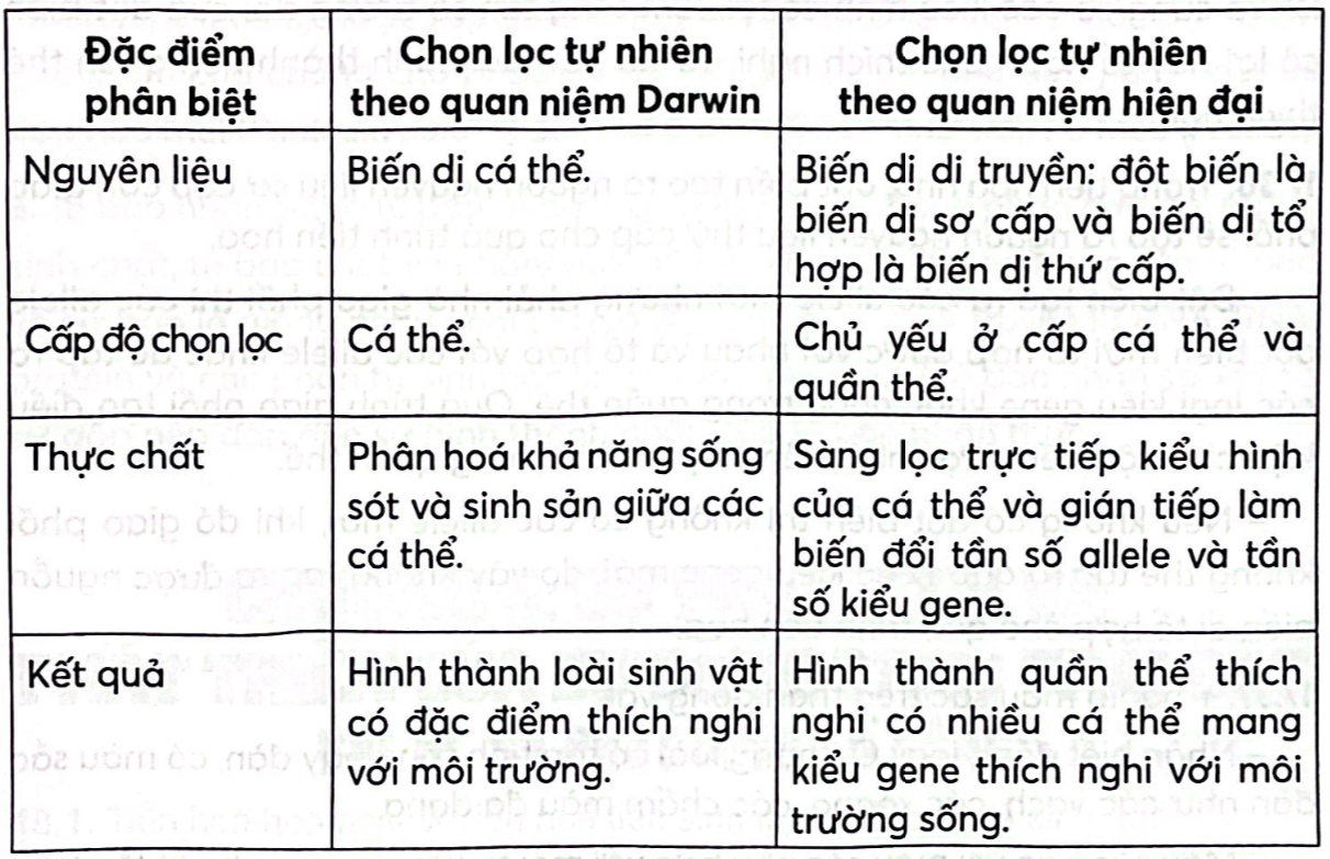 Phân biệt sự khác nhau về chọn lọc tự nhiên theo quan niệm của Darwin và theo quan niệm hiện đại.