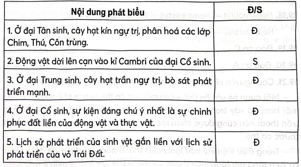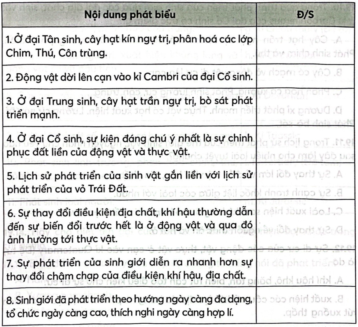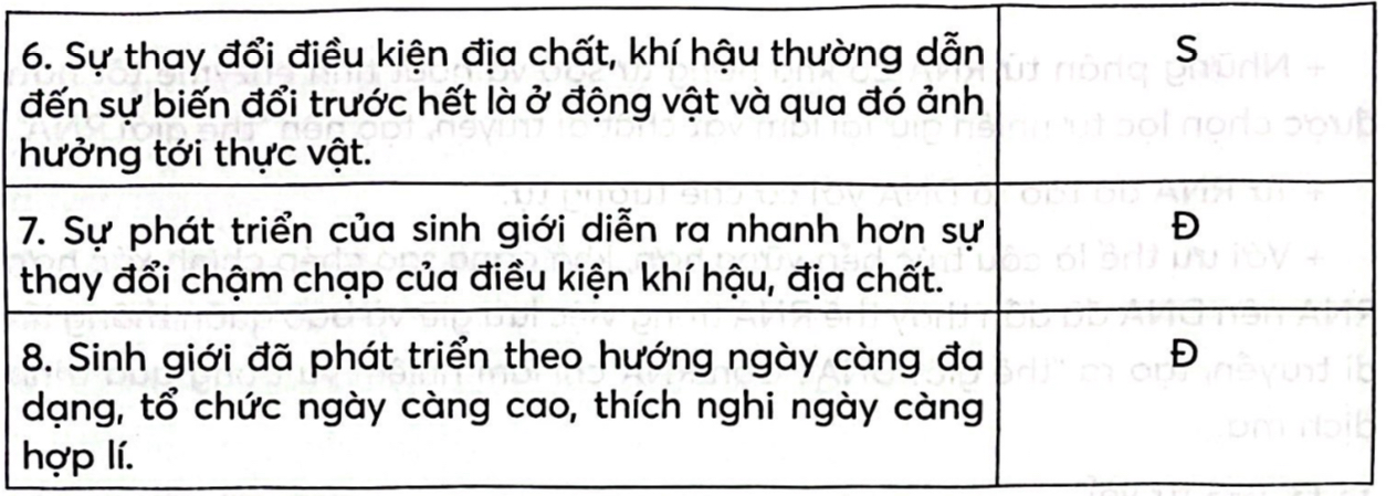 Các phát biểu sau đây là đúng hay sai khi nói về sự phát triển của sinh vật? Nếu đúng ghi Đ, sai ghi S vào cột tương ứng: