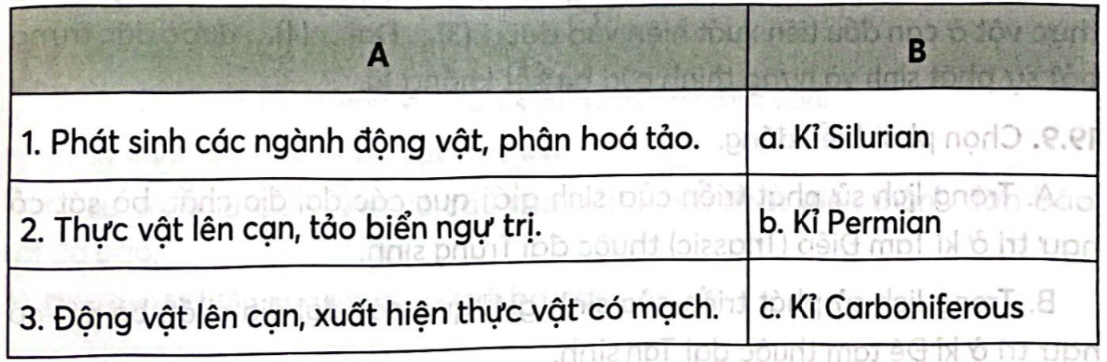 Trong quá trình phát triển của sinh giới qua các đại địa chất, sinh vật ở kỉ Carboniferous của đại Cổ sinh có đặc điểm: Dương xỉ phát triển mạnh. Thực vật có hạt xuất hiện. Lưỡng cư ngự trị. Phát sinh bò sát.